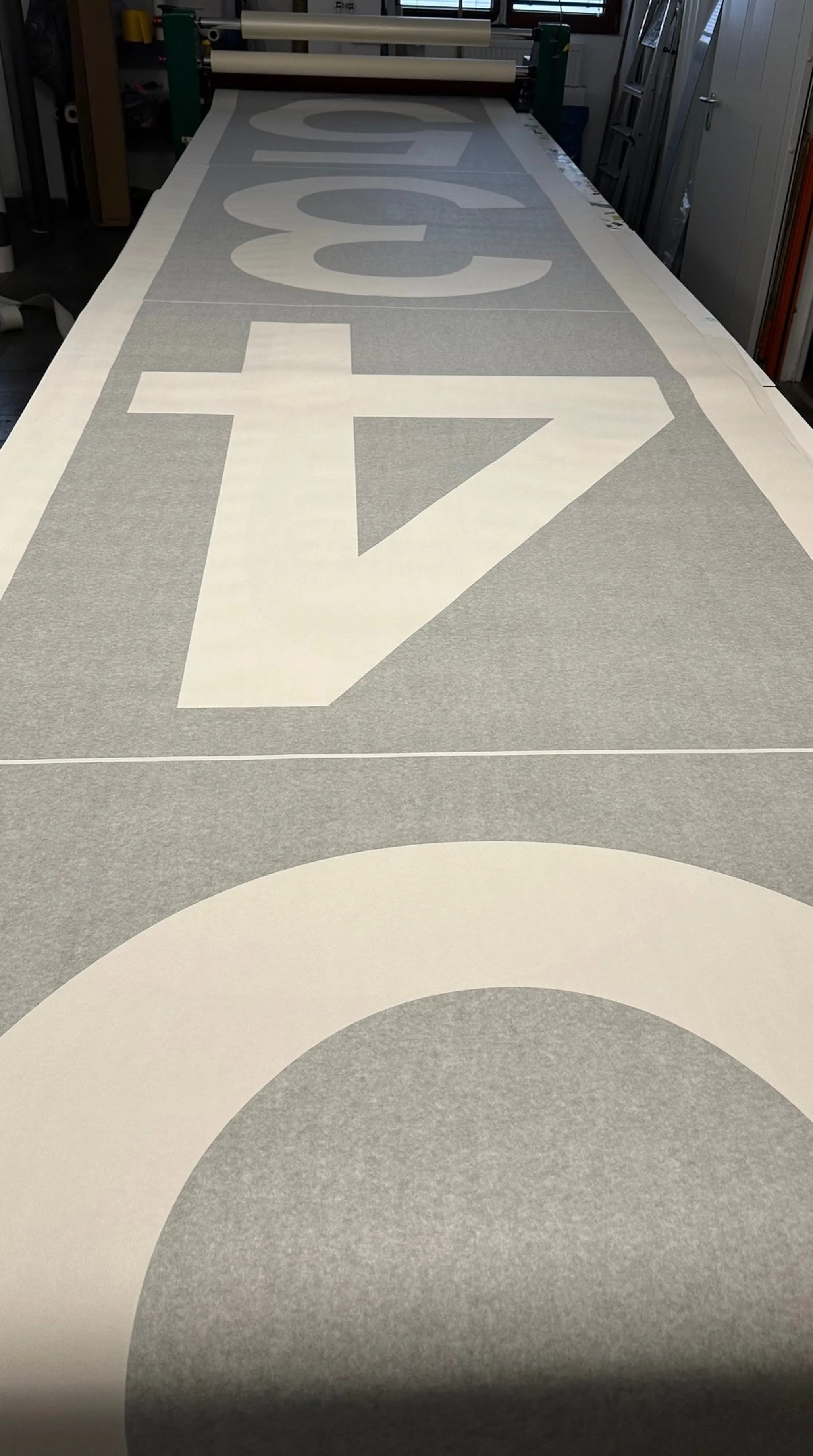Hier laufen die fertig entgitterten Folien durch einen Laminator mit 1650mm Arbeitsbreite und werden so mit einer Übertragungsfolie ausgerüstet, um alle Folienobjekte en bloc passgenau auf der Wandfläche positionieren zu können.